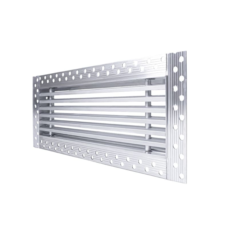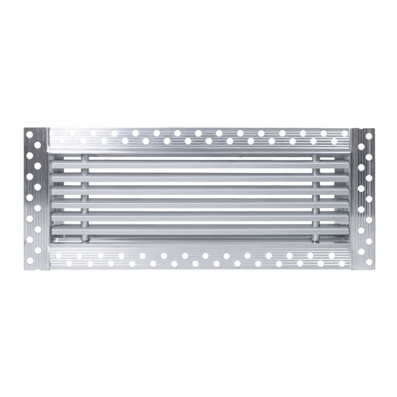 Данная решетка подходит для монтажа на любую поверхность под финишную отделку. Рамка и экран изготовлены из алюминия, опора экрана - из оцинкованной стали. Рама оснащена «полкой» 1,9 мм и рифлеными краями для большей адгезии финишного материала – шпатлевки, цемента. Решетка имеет съемную центральную часть с фиксированным углом наклона ламелей 15°. Она крепится к корпусу прочными металлическими тросиками, легко снимается для очистки и удобного обслуживания.